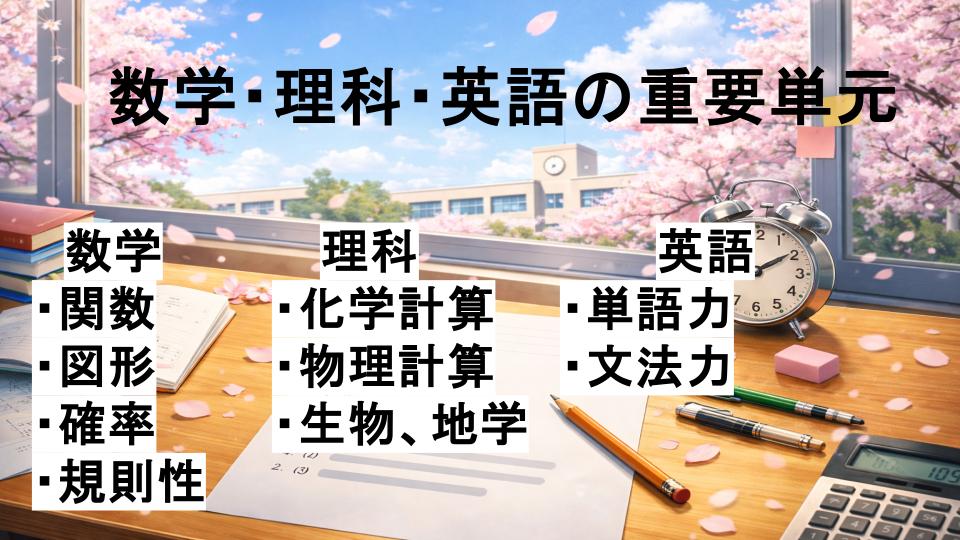 特に、数学や理科は難易度が高く、時間のかかる単元も多いため、早めの学習が大切になってきます。